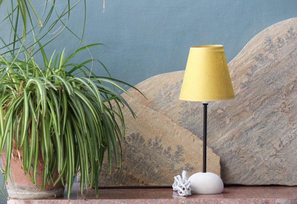 Lampshade from 100% Lokta fiber organic paper – purely recycled & handmade. A truly aesthetic décor catering to high class taste satisfying environmental concerns. Handcrafted by our premium artisans for the top quality international markets. A thin lining of acetate is given underneath the paper for the durability of the shade! The light shimmering out is so unique and carries a classy theme for any type of room / balcony / garden or a bar. Tiny incursions of the dyed or natural Lokta fiber and its paper is having ancient Buddhist / Himalayan history and release spectacular light around. Shade supported by a thin wrought iron pipe as stand. On the top is the standard bulb holder while for the base there is sturdy white high quality marble 0.750 kg stone in oval shape! The lamp looks stunning yet simple – a wonderful handcrafted piece for elegant décor. A 2 meter long wire is given to its sturdy marble base with on / off switch facility.