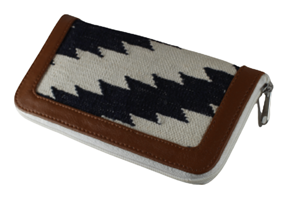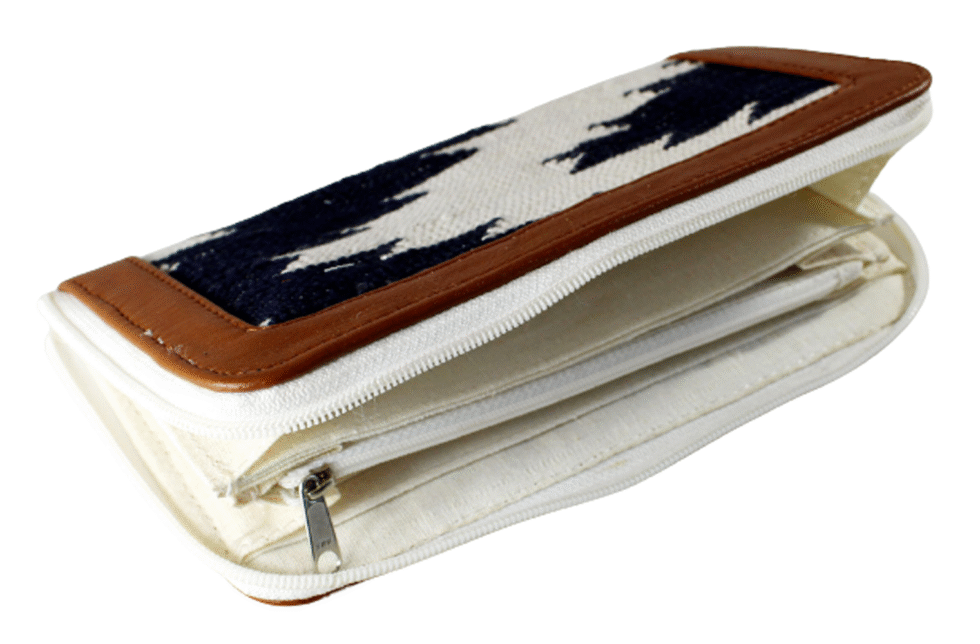 Exquisite kelim / dhurry designed ladies clutch / wallet with multiple pockets to keep cash / currencies / credit cards / mobile etc. For Evening Parties, Cocktail Parties & Social Gatherings. Goes well with party & ethnic wear. Neatly stitched poly cotton woven rug with kelim / dhurry design digitally printed with fine genuine leather piping around it. Inner lining is cotton fabric. Easy to carry and flaunt! A beautiful handcrafted product.
