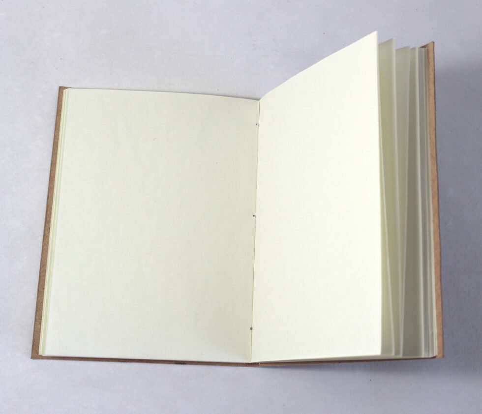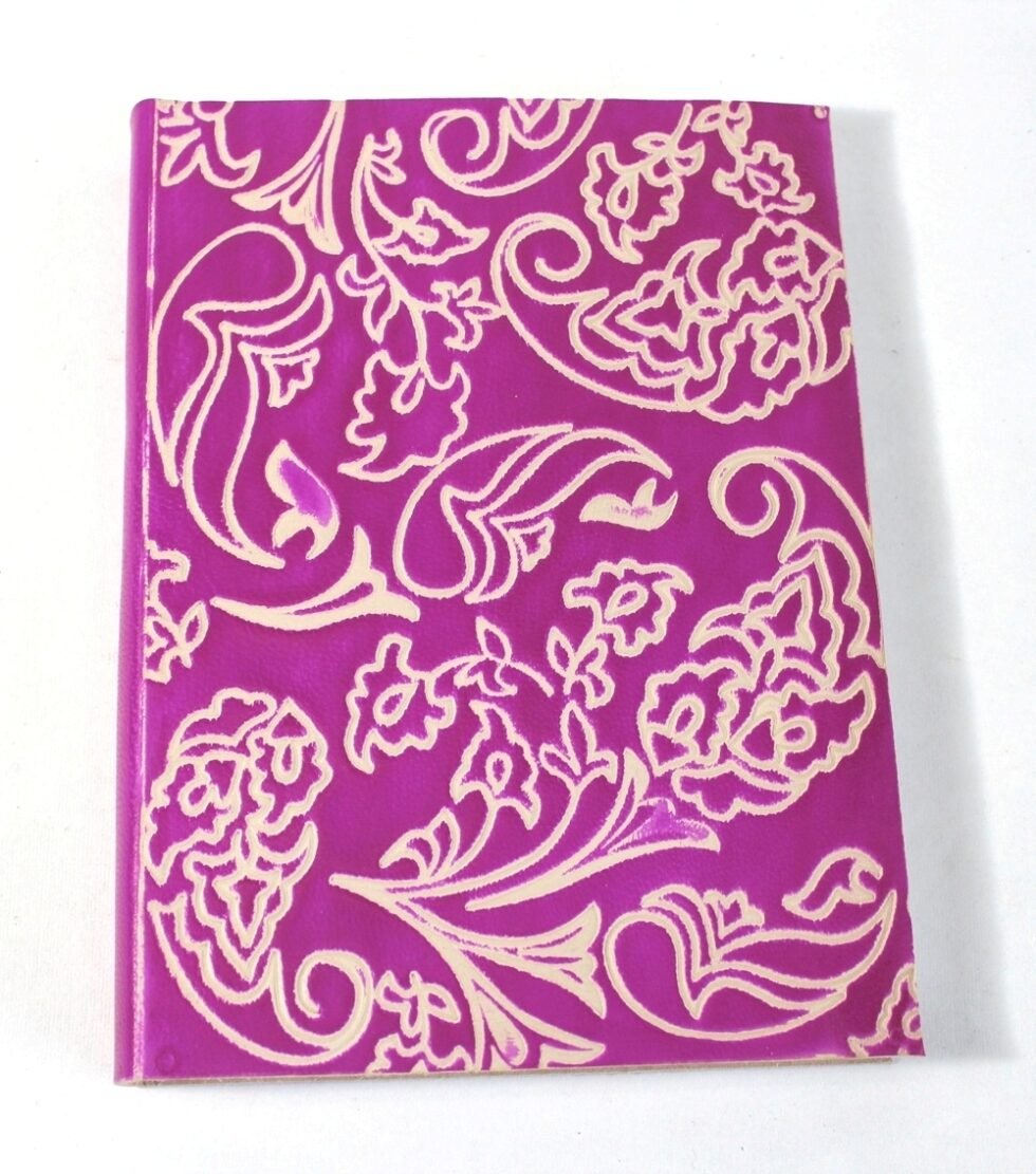 Finest quality of goat TC leather with an debossed design all over the leather cover. Later on the leather is water colour dyed by expert artisans in a way that debossed design looks like ‘carved’ ones! The abrasion effect of leather cover makes the journal very exclusive! Inside is 48 cotton recycled paper sheets (96 pages) which is acid free, wood free and handmade. Never bleeds with ink pen!
