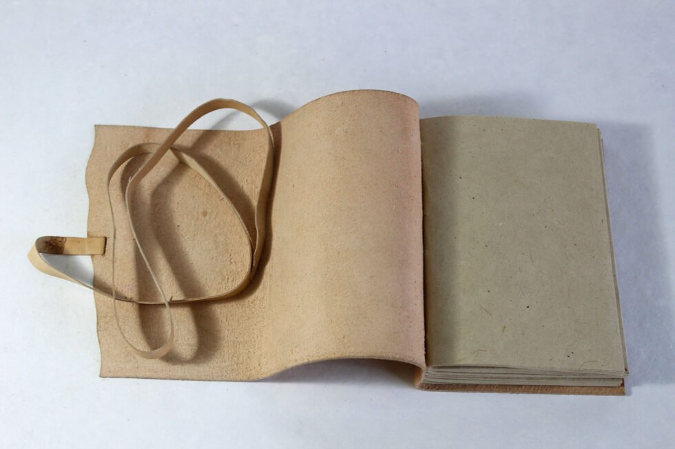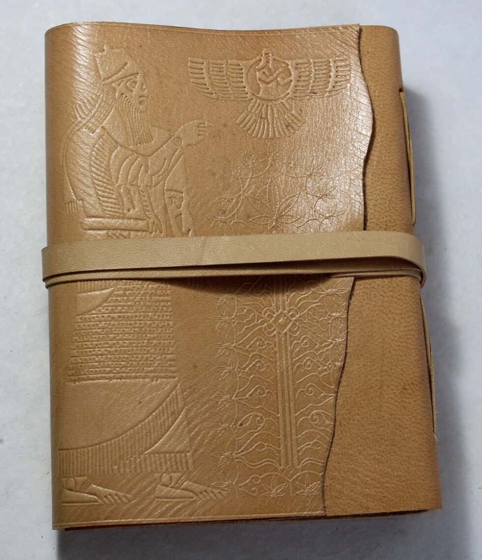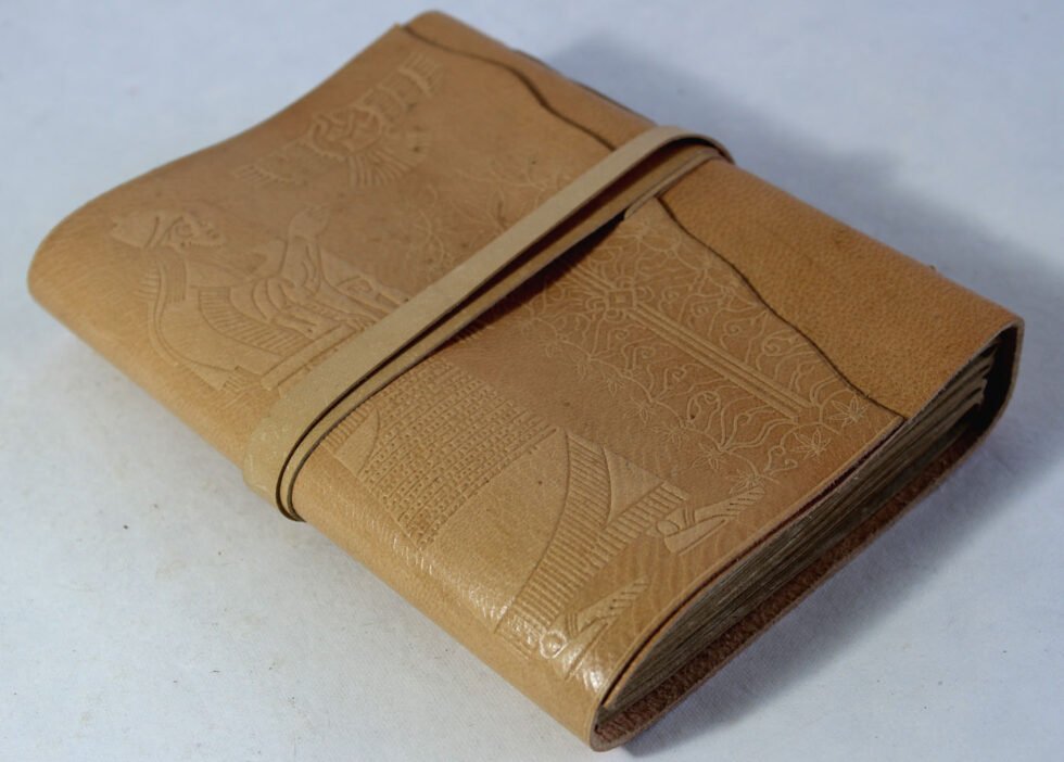 Hand crafted gypsy style wrap around goat leather journal in natural tanned. Hand bound with natural leather strings! Front embossed design is from Sumerian inscription showing Tree of Life and hemp leaves around it! In Sumerian Civilization, hemp was used. Inside is 100 sheets / 200 pages of ‘Hemp Paper’ in natural shade of 70 GSM. Excellent paper to write upon which never bleeds with ink or even in painting! Recycled paper, handmade paper, wood free paper – with Ph level 7 or higher – its an acid free paper too!