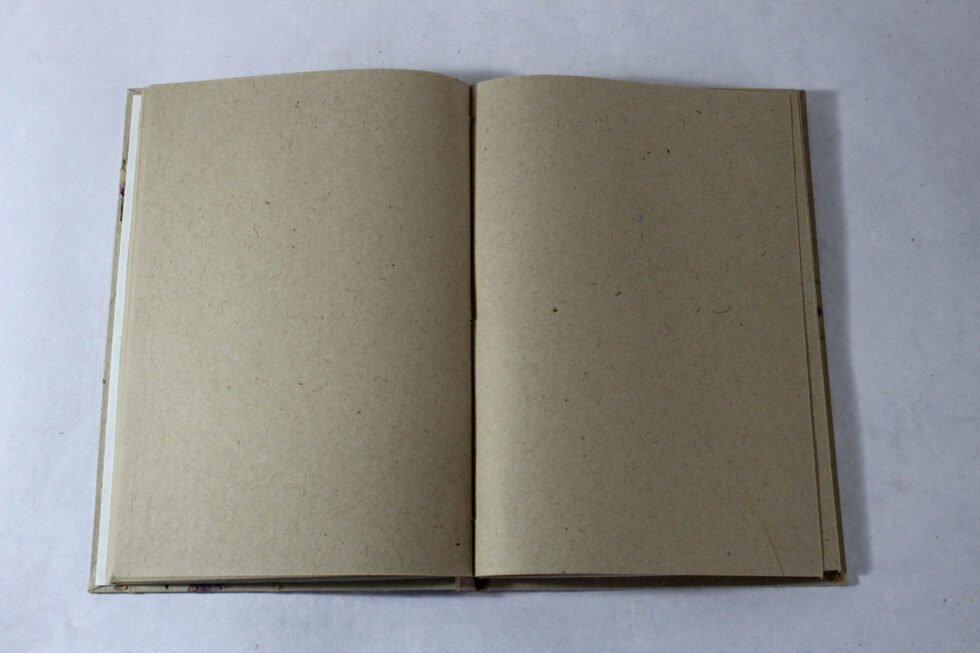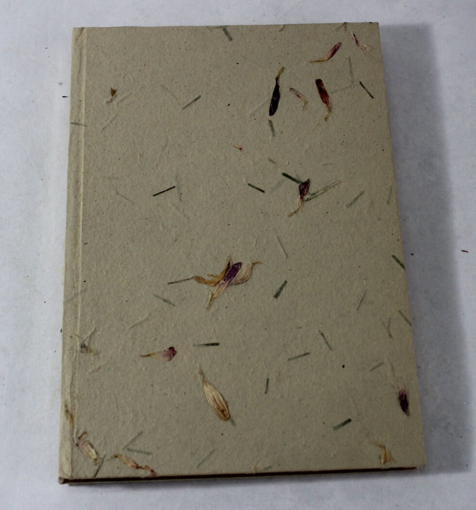 Hard cover jute notebook with jute garden paper with flower petals and grass! Inside is 48 sheets / 96 pages of ‘Jute Paper’ in natural shade of 70 GSM. Excellent paper to write upon which never bleeds with ink or even in painting! Truely recycled paper, handmade paper, wood free paper – with Ph level 7 or higher – its an acid free paper too!