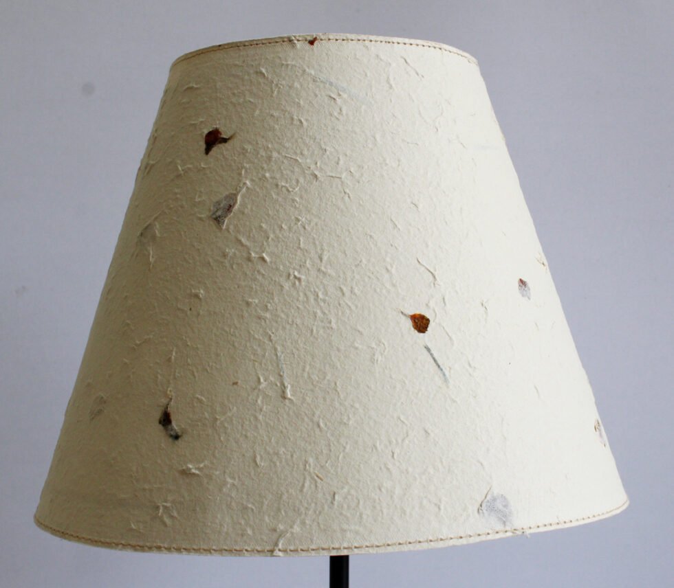 Lampshade from 100% Hemp fiber organic paper – purely recycled & handmade. A truly aesthetic décor catering to high class taste satisfying environmental concerns. Handcrafted by our premium artisans for the top quality international markets. A thin lining of acetate is given underneath the paper for the durability of the shade! The light shimmering out is so unique and carries a classy theme for any type of room / balcony / garden & bar. Tiny incursions of the dyed or natural Hemp fiber along with the grass & flower petals release spectacular light around. Shade supported by a thin wrought iron pipe as stand. On the top is the standard bulb holder while for the base there is sturdy white high quality marble 0.750 kg stone in oval shape! The lamp looks stunning yet simple – a wonderful handcrafted piece for elegant décor. A 2 meter long wire is given to its sturdy marble base with on / off switch facility.