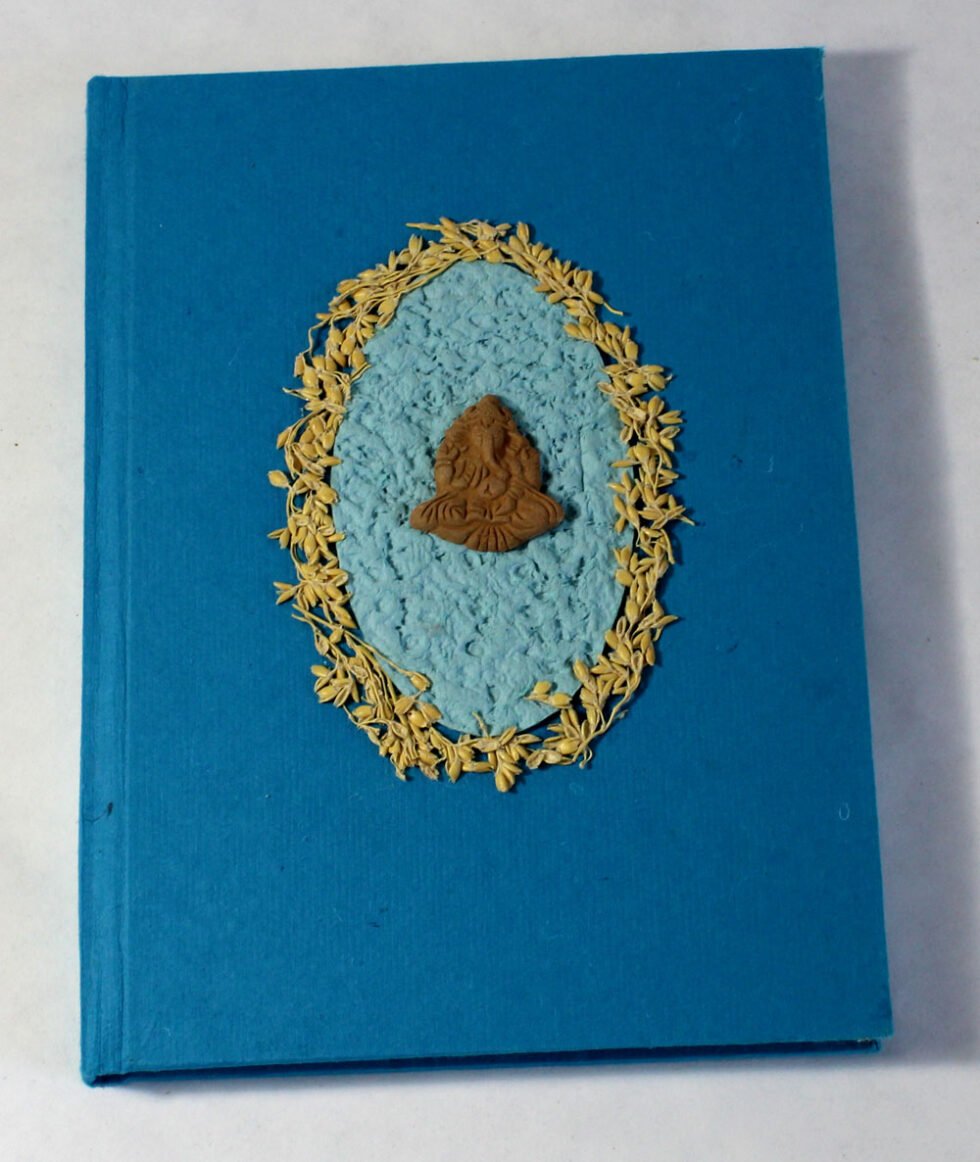 Beautiful collage design by gluing down a special paper in oval shape known as ‘Moon Rock’ on the front cover of the notebook. Further surrounded by the auspicious white grass around its border. In the centre, Lord Ganesh – The God of wisdom & Wealth, is placed, making it a very unique Diwali Present! A beautiful aesthetically made symbolic Diwali Present, and very auspicious too, for someone you wish very special! Just inside both the covers, front and back, there is another thick cream colour wood free / acid free paper sheet layer, holding the inside writing pages gracefully. In the middle, 48 sheets / 96 pages for smooth writing which never bleed with the ink or in calligraphy and can be a lovely travel book / art and craft book or a book – keeping domestic accounts and other valuable notes & details.