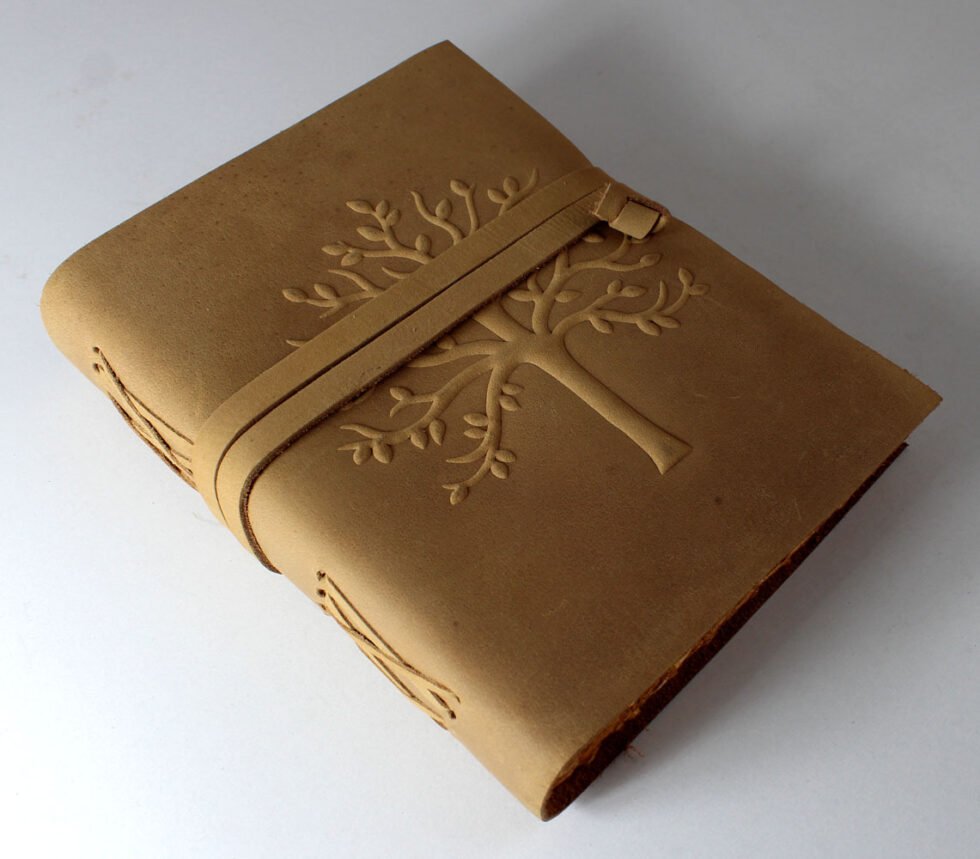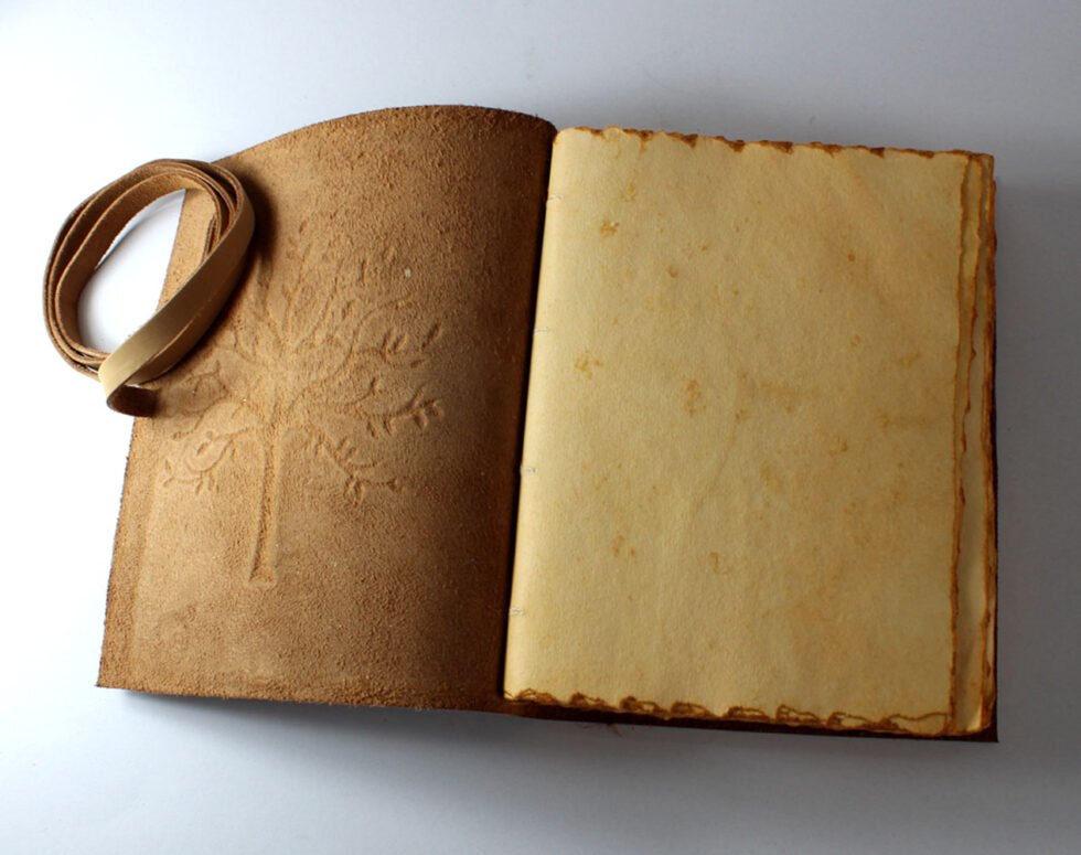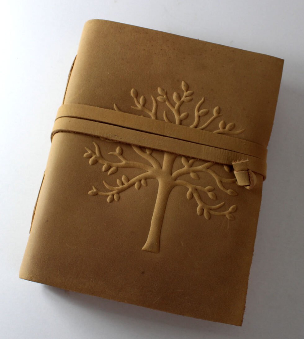 Premium buffalo leather journal with a soft yet tough texture, tree-embossed cover, and rustic spine stitching. Includes 120 unlined natural-edged sheets (240 pages) of recycled cotton paper – wood-free, acid-free, and ink-friendly. A perfect gift for all ages!