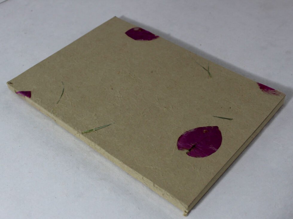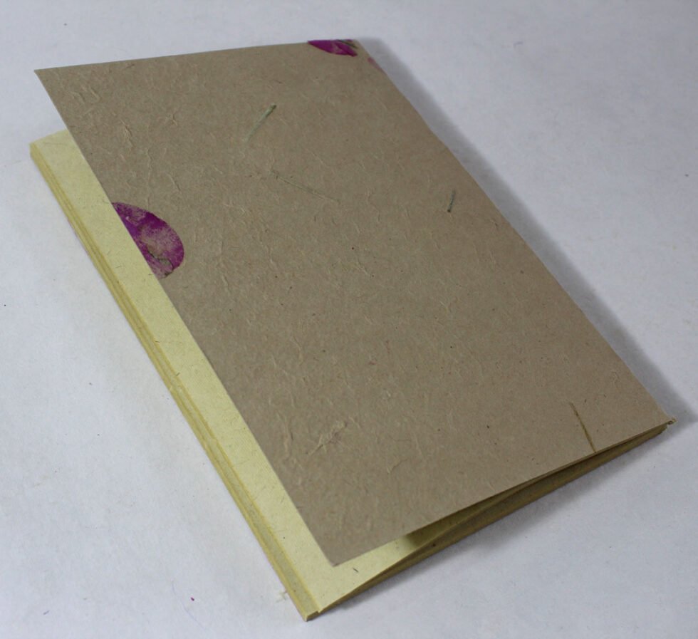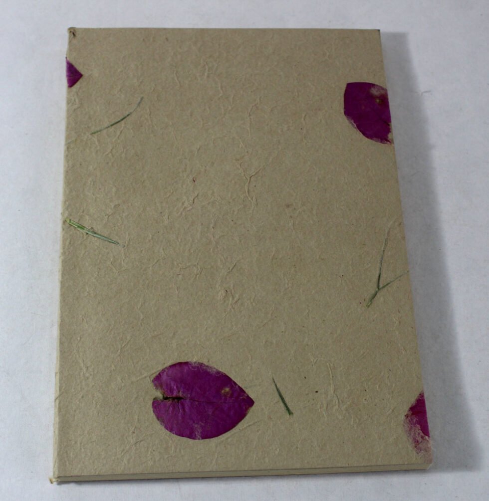Soft cover hemp notebook with ‘Garden Hemp Paper’ on its cover with flower petals and grass. Inside is 48 sheets / 96 pages of ‘Hemp Paper’ in natural shade of 70 GSM. Excellent paper to write upon which never bleeds with ink or even in painting! Truely recycled paper, handmade paper, wood free paper – with Ph level 7 or higher – its an acid free paper too! Having ancient history, hemp paper has been used since 2000 years back! Even the first few Bible covers are found from the Cannabis hemp paper! The paper has longer fibres hence the tensile strength is very strong – one reason, this was used for currencies too in Mediaval history!